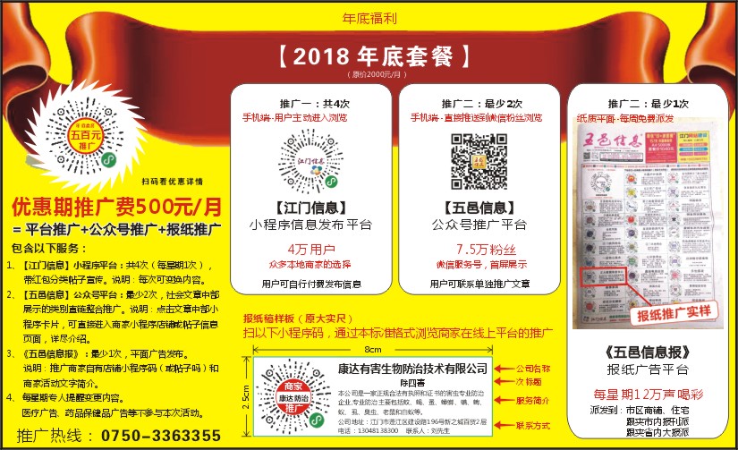 1、【江门信息】小程序平台:共4次(每星期1次),带红包分类帖子宣传。说明:每次可变换内容。