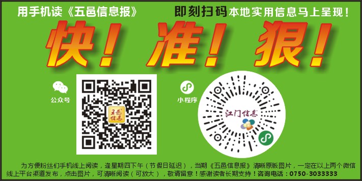为方便粉丝们手机线上阅读,逢星期四下午(节假日延迟),当期《五邑信息报》清晰原版图片,一定在以上两个微信线上平台渠道发布,点击图片,可清晰阅读(可放大),敬请留意!感谢读者长期支持!咨询电话:0750-3033333
