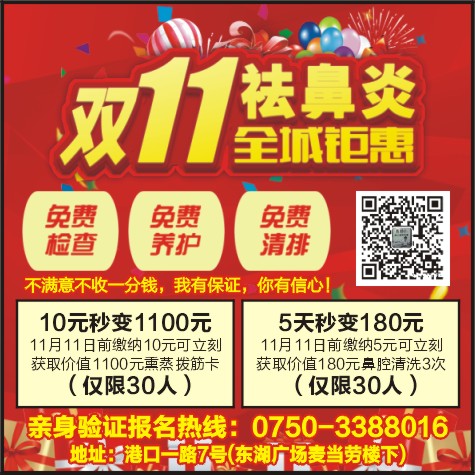 11月11日前缴纳5元可立刻获取价值180元鼻腔清洗3次