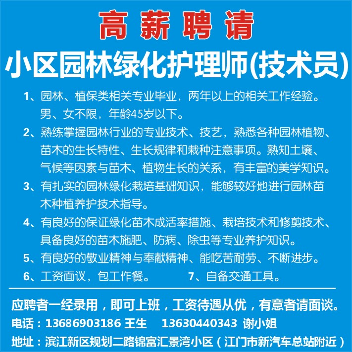 1、园林、植保类相关专业毕业,两年以上的相关工作经验。男、女不限,年龄45岁以下。