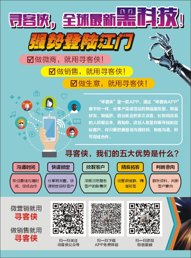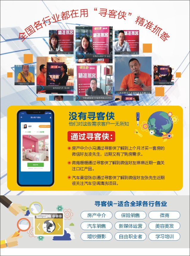 “寻客侠”是一款APP。通过“寻客侠APP”像平时一样,分享产品或活动到微信朋友圈、微信好友、微信群,后台就会把多次点击,长时间浏览的人抓取出来,通知你,这些人就是你要寻找的目标客户,你只要把握最佳沟通时间,和他沟通,即可促成合作。