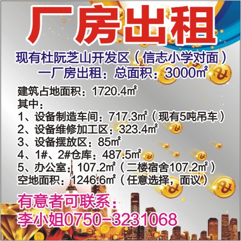一厂房出租:总面积:3000㎡