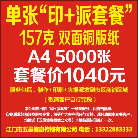服务包括:制作+印刷+夹报派发到市区商铺区域(敬请客户自行完税)