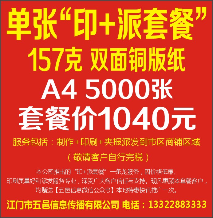 本公司推出的“印+派套餐”一条龙服务,因价格低廉、印刷质量好和派发服务专业,深受广大客户信任与支持。现凡惠顾本套餐客户,均赠送【五邑信息微信公众号】本地特惠快讯推广一次。