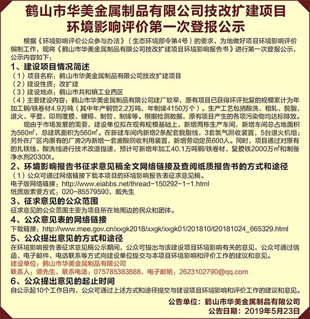 根据《环境影响评价公众参与办法》(生态环境部令第4号)的要求,为地做好项目环境影响评价编制工作,现将《鹤山市华美金属制品有限公司技改扩建项目环境影响报告书》进行第一次登报公示,公示内容如下: