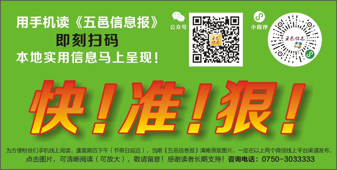 为方便粉丝们手机线上阅读,逢星期四下午(节假日延迟),当期《五邑信息报》清晰原版图片,一定在以上两个微信线上平台渠道发布,点击图片,可清晰阅读(可放大),敬请留意!感谢读者长期支持!咨询电话:0750-3033333