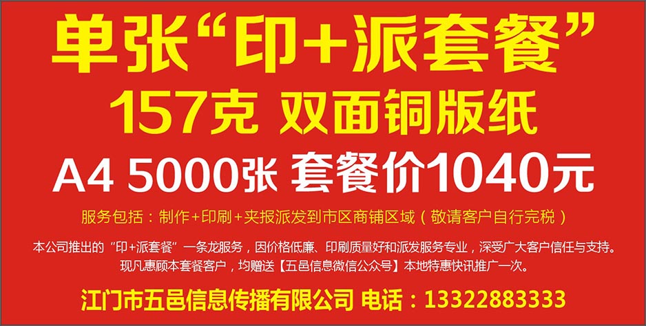 本公司推出的“印+派套餐”一条龙服务,因价格低廉、印刷质量好和派发服务专业,深受广大客户信任与支持。现凡惠顾本套餐客户,均赠送【五邑信息微信公众号】本地特惠快讯推广一次。