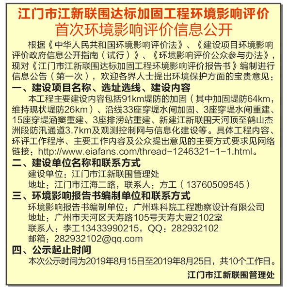 江门市江新联围达标加固工程环境影响评价首次环境影响评价信息公开 根据《中华人民共和国环境影响评价法》、《建设项目环境影响评价政府信息公开指南(试行)》、《环境影响评价公众参与办法》,现对《江门市江新联围达标加固工程环境影响评价报告书》编制进行信息公告(第一次),欢迎各界人士提出环境保护方面的宝贵意见: 一、建设项目名称、选址选线、建设内容 本工程主要建设内容包括91km堤防的加固(其中加固堤防64km,维持现状堤防26km)、沿线33座穿堤水闸加固、3座穿堤水闸重建、15座穿堤涵窦重建、3座排涝站重建、新建江新联围天河顶至鹤山杰洲段防汛通道3.7km及观测控制网与信息化建设等。具体工程内容、环评工作程序、主要工作内容及公众提出意见的主要方式要求见网络链接:http://www.eiafans.com/thread-1246321-1-1.html。 二、建设单位名称和联系方式 建设单位:江门市江新联围管理处 地址:江门市江海二路 联系人:方工(13760509545) 三、环境影响报告书编制单位和联系方式 环境影响报告书编制单位:广州珠科院工程勘察设计有限公司 地址:广州市天河区天寿路105号天寿大夏2102室 联系人:李工(13433990215),QQ:282932102,邮箱:282932102@qq.com 四、公示起止时间 本次公示时间为2019年8月15日至2019年8月25日,共10个工作日。