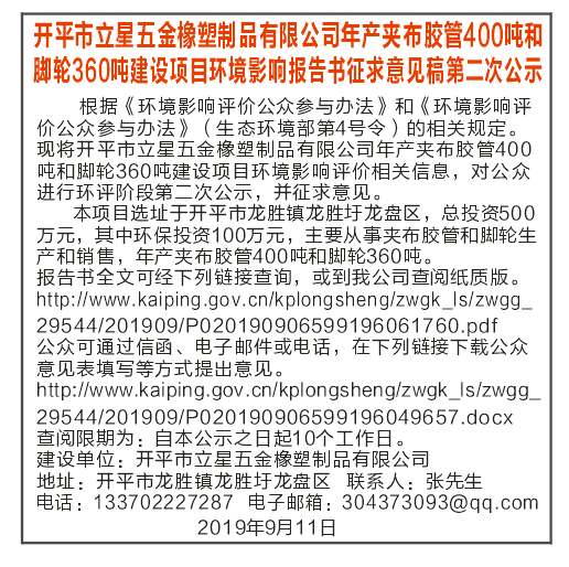 根据《环境影响评价公众参与办法》和《环境影响评价公众参与办法》(生态环境部第4号令)的相关规定。现将开平市立星五金橡塑制品有限公司年产夹布胶管400吨和脚轮360吨建设项目环境影响评价相关信息,对公众进行环评阶段第二次公示,并征求意见。 本项目选址于开平市龙胜镇龙胜圩龙盘区,总投资500万元,其中环保投资100万元,主要从事夹布胶管和脚轮生产和销售,年产夹布胶管400吨和脚轮360吨。 报告书全文可经下列链接查询,或到我公司查阅纸质版。 http://www.kaiping.gov.cn/kplongsheng/zwgk_ls/zwgg_29544/201909/P020190906599196061760.pdf 公众可通过信函、电子邮件或电话,在下列链接下载公众意见表填写等方式提出意见。 http://www.kaiping.gov.cn/kplongsheng/zwgk_ls/zwgg_29544/201909/P020190906599196049657.docx 查阅限期为:自本公示之日起10个工作日。 建设单位:开平市立星五金橡塑制品有限公司 地址:开平市龙胜镇龙胜圩龙盘区 联系人:张先生 电话:133702227287 电子邮箱:304373093@qq.com