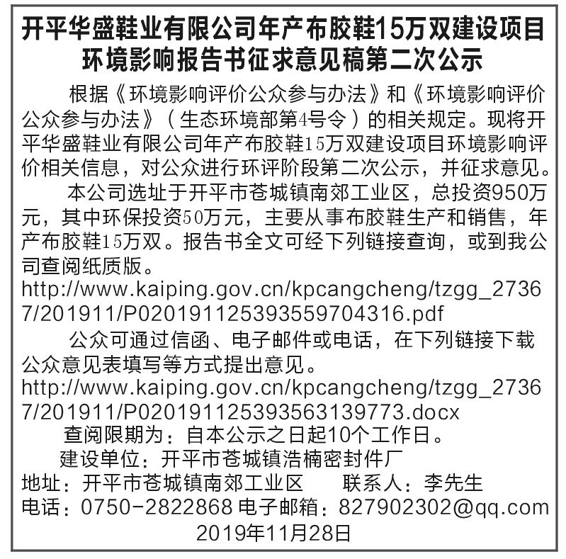 根据《环境影响评价公众参与办法》和《环境影响评价公众参与办法》(生态环境部第4号令)的相关规定。现将开平华盛鞋业有限公司年产布胶鞋15万双建设项目环境影响评价相关信息,对公众进行环评阶段第二次公示,并征求意见。 本公司选址于开平市苍城镇南郊工业区,总投资950万元,其中环保投资50万元,主要从事布胶鞋生产和销售,年产布胶鞋15万双。 报告书全文可经下列链接查询,或到我公司查阅纸质版。 http://www.kaiping.gov.cn/kpcangcheng/tzgg_27367/201911/P020191125393559704316.pdf 公众可通过信函、电子邮件或电话,在下列链接下载公众意见表填写等方式提出意见。 http://www.kaiping.gov.cn/kpcangcheng/tzgg_27367/201911/P020191125393563139773.docx 查阅限期为:自本公示之日起10个工作日。 建设单位:开平市苍城镇浩楠密封件厂 地址:开平市苍城镇南郊工业区 联系人:李先生 电话:0750-2822868 电子邮箱:827902302@qq.com